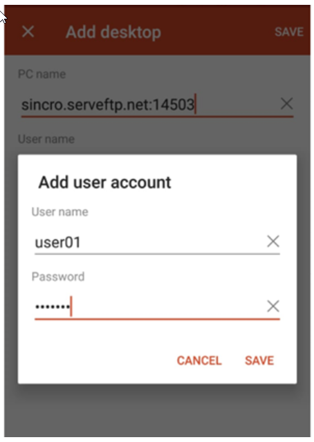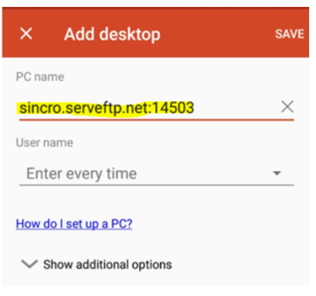 5 – No espaço reservado para o PC name, digite o endereço “sincro.serveftp.net:”, seguido do número da porta de acesso (consultar esta informação com o suporte)