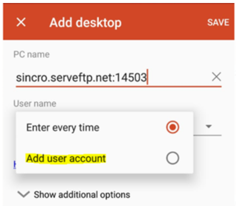 6 – As credencias podem ser salvas para que o acesso seja feito automaticamente, ou usuário pode optar para que o aplicativo solicite as credenciais em todos os acessos. Caso o usuário queira deixar as credenciais salvas, selecione a opção “Add user account”
