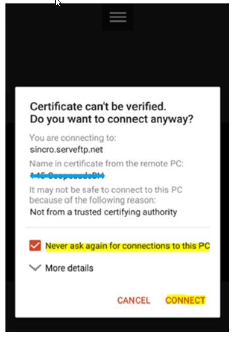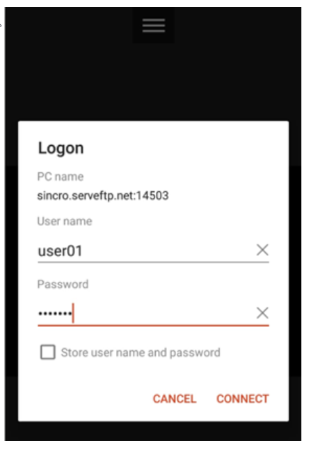 10 – Se foi configurado para o aplicativo solicitar as credenciais em todos os acessos, nesse momento é necessário informar login e senha, usados para a acessar a Sincro Nuvem. Depois clique em “connect”.