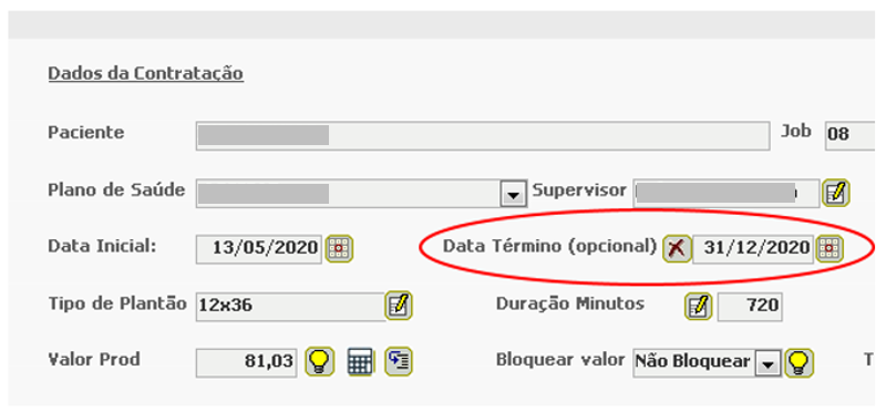 Essa Data Término poderá ser alterada durante o processo de alocação de profissionais, seja tornando-a Nula, seja definindo uma data futura qualquer. Observe, porém, que essa data será considerada no agendamento de todos os profissionais, por ser uma valor típico da Contratação.