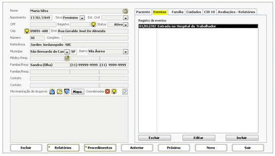 Aqui podem ser cadastrados eventos pelo qual o paciente passou, registro de histórico como entrada no hospital, alta etc.
