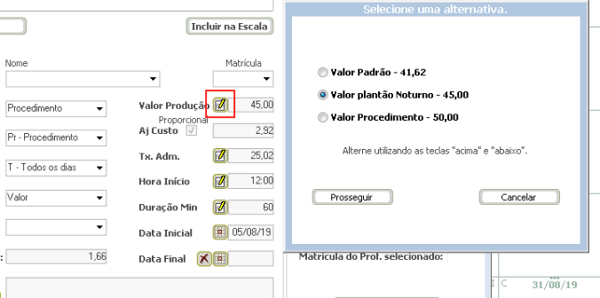 Foi inserida uma nova funcionalidade no Módulo de Escala, que é acessada a partir do comando sinalizado, à direita do campo de Valor da Produção.