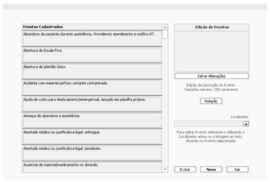 Na tela abaixo são cadastrados os tipos de evento cujo controle se deseja fazer, sendo o acesso tanto a esta tela como à de Registro de ocorrências  gerenciável através do Controle de Acesso.