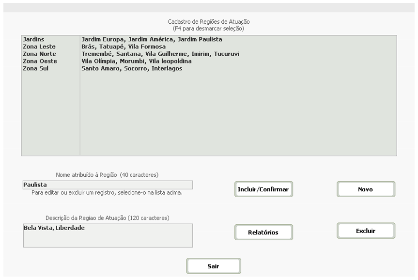 O procedimento se inicia com a definição de regiões adequada à necessidade de cada empresa. Isso poderá ser feito na janela abaixo exibida, que se acessa através da Aba Cadastros, grupo Outros, Regiões de Atuação: